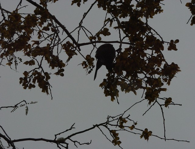 Having spent the previous night in the neighborhood of the Fox Glacier, we were intent on arranging for a helicopter tour of it this morning. Unfortunately, we missed the bus by five minutes and there were no further tours that day due to bad weather (the weather seems to be a real limiting factor in this country). So I consoled myself by taking a picture of a strange bird that was perched in a tree on the walk back from the glacier tour office. It's not a very good photograph, but it was fine consolation at the time.